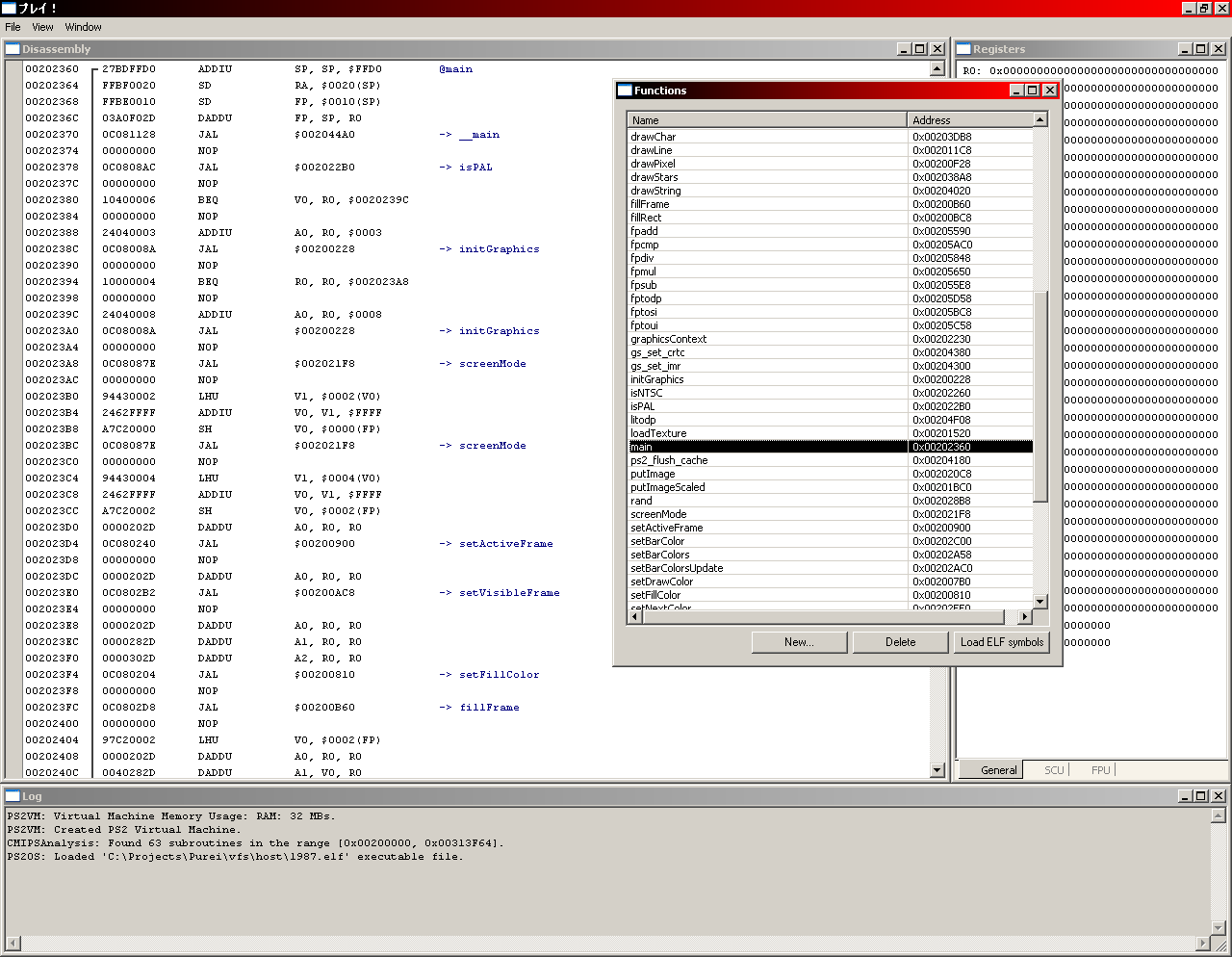 Unfortunately, I don't have any screen shots to show you for now as it doesn't run at all on Purei. It also seems to work a bit wierd on nSX2. But from the looks of it, it seems to be an old school type of demo. Looking at the disassembly real fast, I could see that it's using some FPU stuff, which should be interesting to implement. But first, I gotta make some adjustments to the debugger and user interface. I've been working on better function defineing in the debugger for easier navigation in the disassembly. I also found some deadlock problem with the Log/VM/UI threads which I'm currently working on fixing. Hopefully, I'll have some preliminary screen shots to show tomorrow. Tasks: - Add better function navigation in the debugger. - Save function names in a file and load this file when the emulator is loaded. - Add a function editor window. This window will let you add functions, jump to functions and import function names from the ELF symbol table. - Display jump targets names in the disassembly. - Implement basic COP0 support. - Implement basic COP1 (FPU) support. |