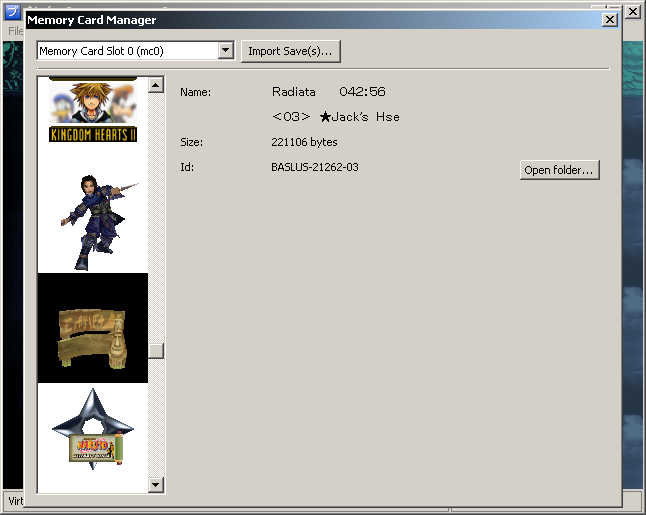 It's not yet complete, and here's what I'd like to have done in this development : - Add a 'close' button in the bottom of the window. - Make the memory card switching (from memory card 0 to 1 for example) work. - Fix a speed problem when loading icon data from the disk. - Make a message box appear when the save data already exists when importing. - Add another viewport in the bottom that'll allow to rotate the icon and select which icon to display (there's 3 different ones) - Add an option to export and delete the selected save. - Display the date of last modification. Well, that's pretty much it... I'll be working on adding those points tomorrow. |