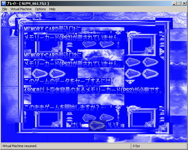 As I suspected, the game uses a VU microprogram to display a simple 2D screen: It seems that we're getting to the point where the game displays the screen to ask if the player wants to play without a memory card. Even though the textures are totally screwed up, the thing seems to be accurate primitive wise and we can even see the backgrounds of the "windows" moving like it does in the game. I'm going to work on getting the textures to be displayed correctly next. |