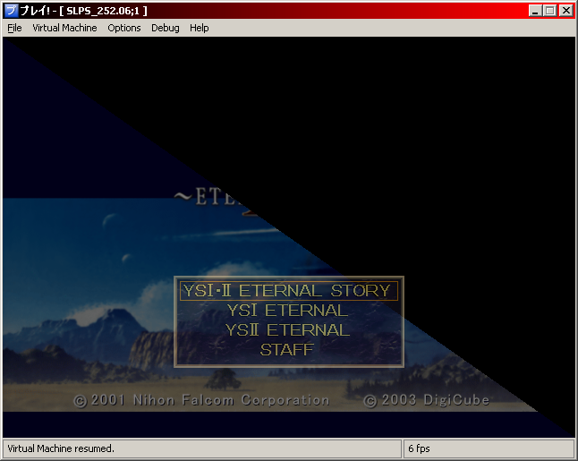 But while looking through the movie player code, I was able to find something that checks the status of a button to skip the movie scene. I patched the executable so that it always skips the movies and that enabled the program to go further. We are able to play the game with this patch, even though it's a bit limited : it crashes as soon as we hit an enemy, and there's also a couple of problems with the GS handler. Also note that to be able to see that much of the game, a little hack in the GS handler was required to force an alpha blending formulae. There's multiple layers of rectangle areas that have transparent area to let the underneath layer show something. I think there's one for the status text, one for fancy the border with Feena and Reah and one for the game. The reason everything looks translucent is also because of this hack. There's also a little bug with the character sprites that make them show an extra frame when moving around (certainly due to a CPU problem). But I don't really want to concentrate on this for the moment... I'd like to have the IPU done at a decent level before fixing any problems with the game. So I'll be continuing my search for the solution tomorrow. |